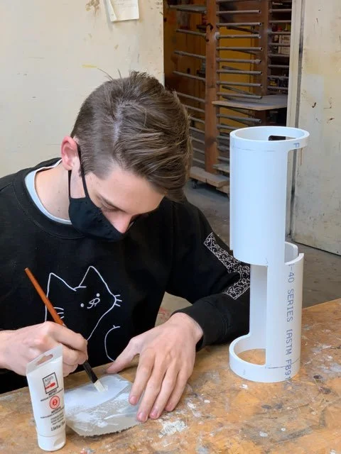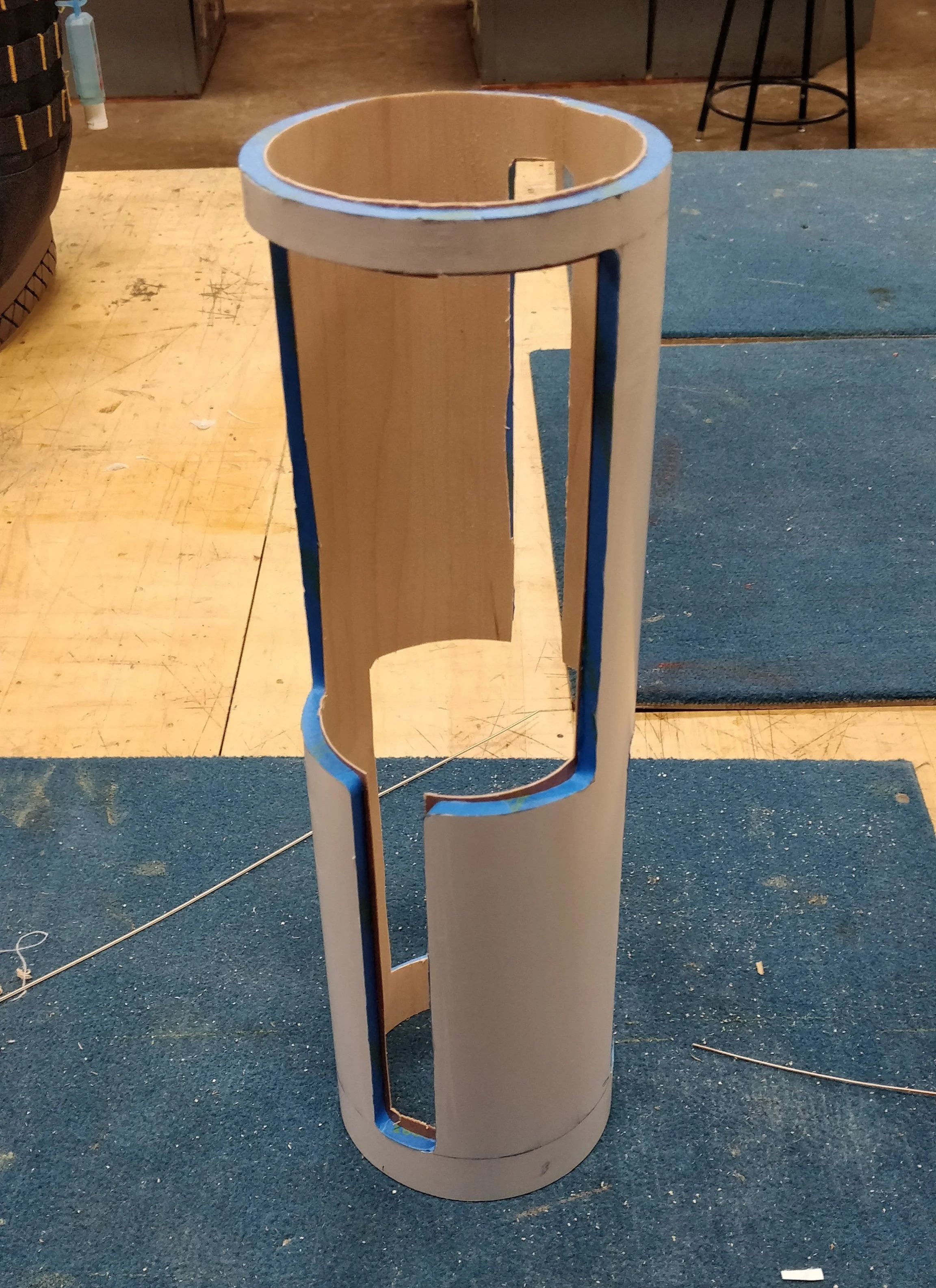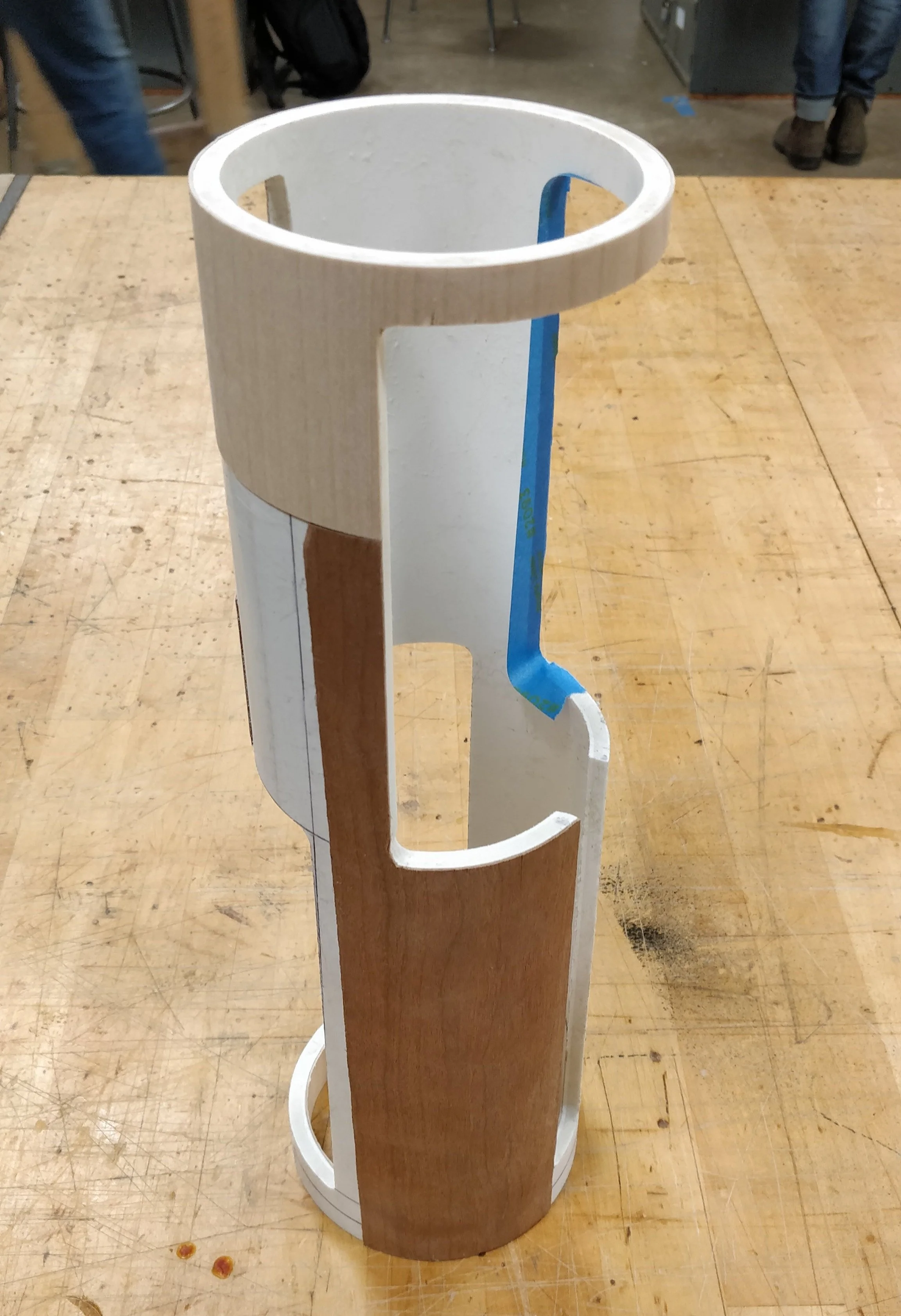 In order to bring industrial elements into my layering scheme I milled pockets out of PVC pipe which acted as the main structure. I experimented with pre applying veneers to the pipe and milling my shapes in but unfortunately the veneers would blow out.