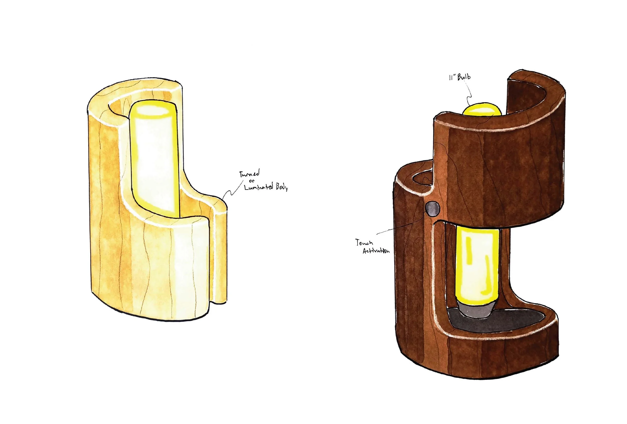 I initially looked into reflecting and bouncing light using different planes and surfaces. During ideation I changed my focus to look at how I could merge industrial materials with the cross section of a tree.